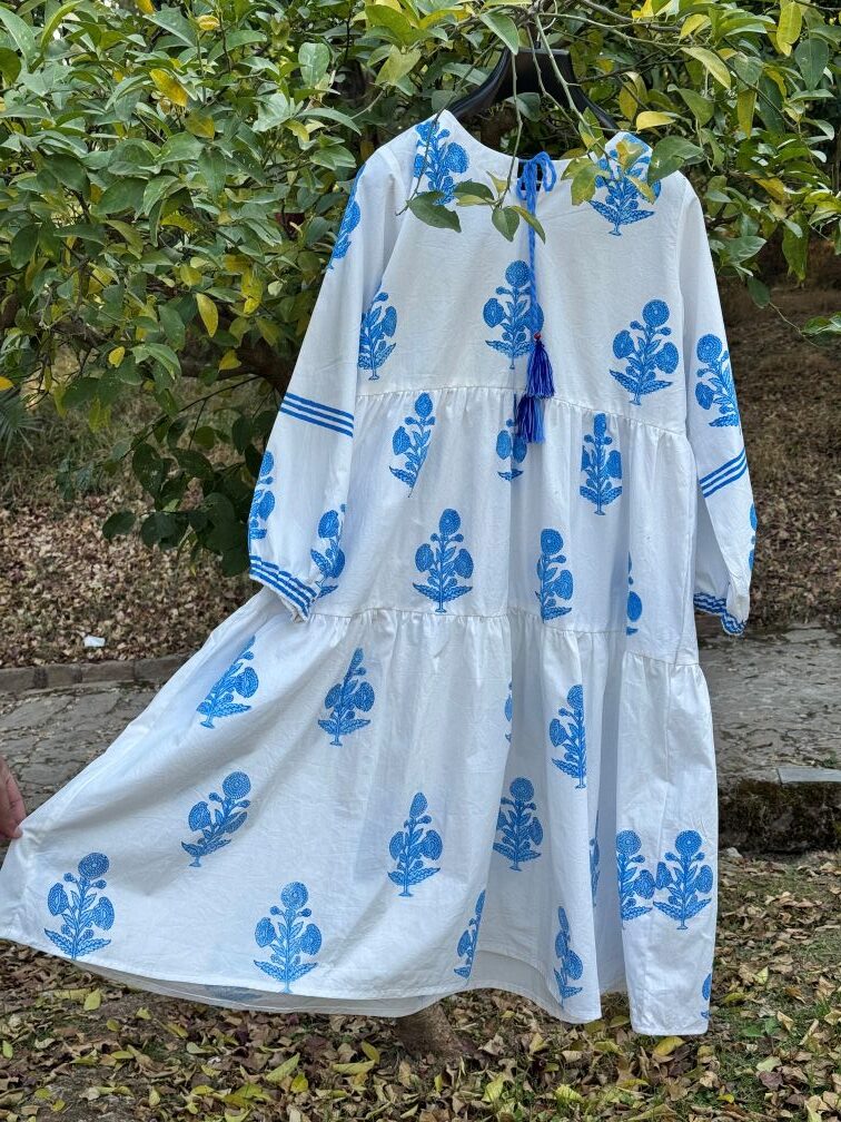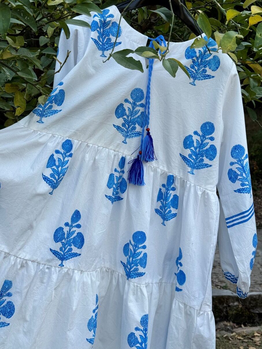 Breathe in the calm of coastal hues with Azure Bloom, a handcrafted white cotton dress adorned with intricate sky-blue floral block prints.