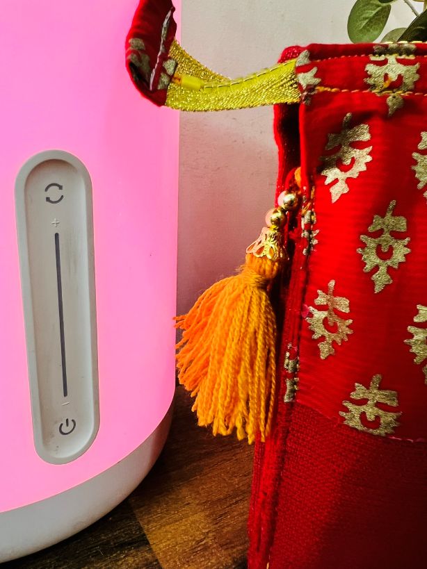 A red pouch with golden motifs, tassel zip, and an internal pocket for organized space. A chic accessory and a unique gift option.