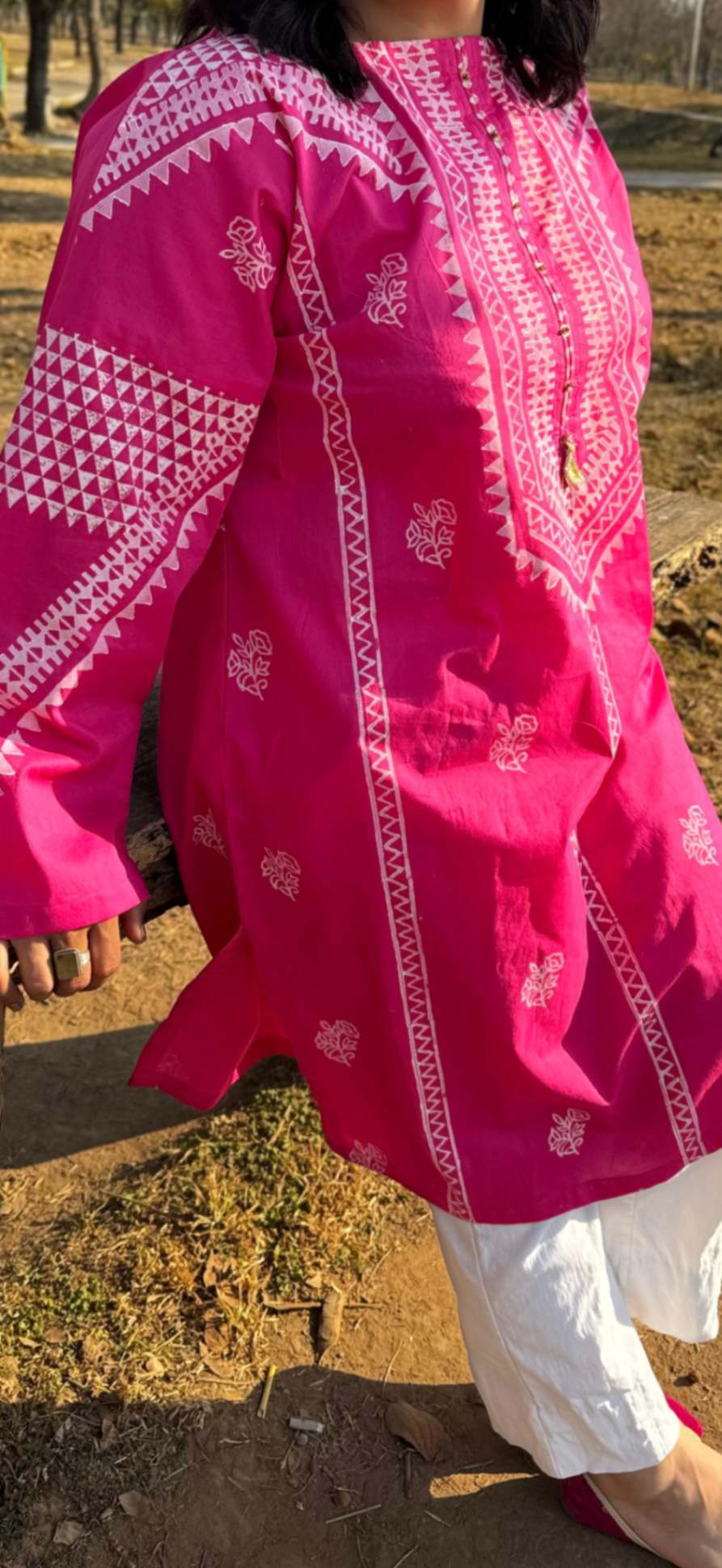 Bold and striking, Fuchsia Noor is a hand block printed kurta crafted in vibrant fuchsia, detailed with refreshing white geometric motif impressions.