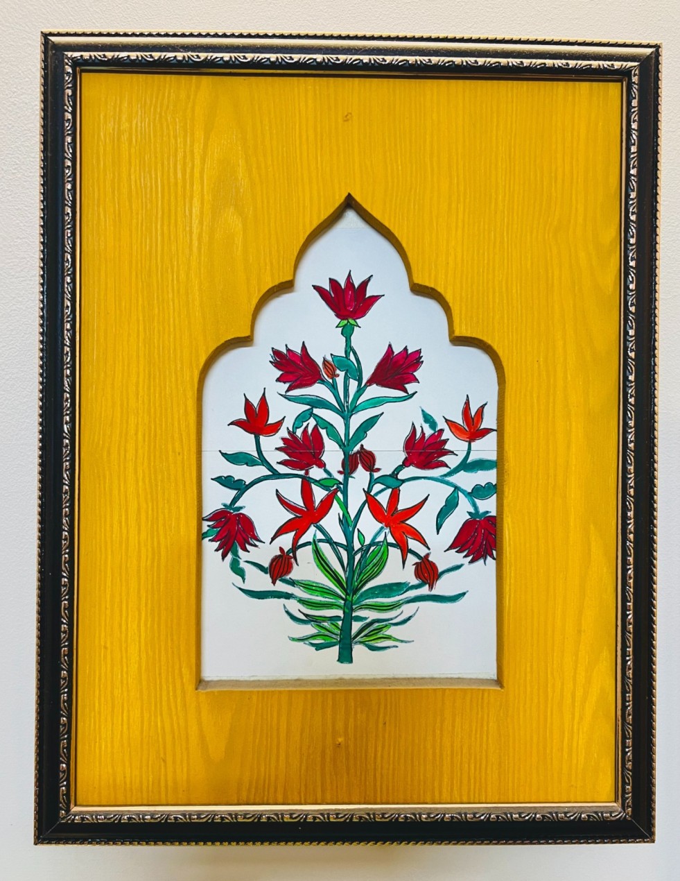 This handmade artwork draws inspiration from Mughal architecture, featuring intricate floral motifs framed within a classic jharoka cut. Each detail reflects the richness of heritage, preserved with a glossy resin finish to ensure lasting beauty. Timeless and elegant, it adds a touch of cultural sophistication to any living space.
