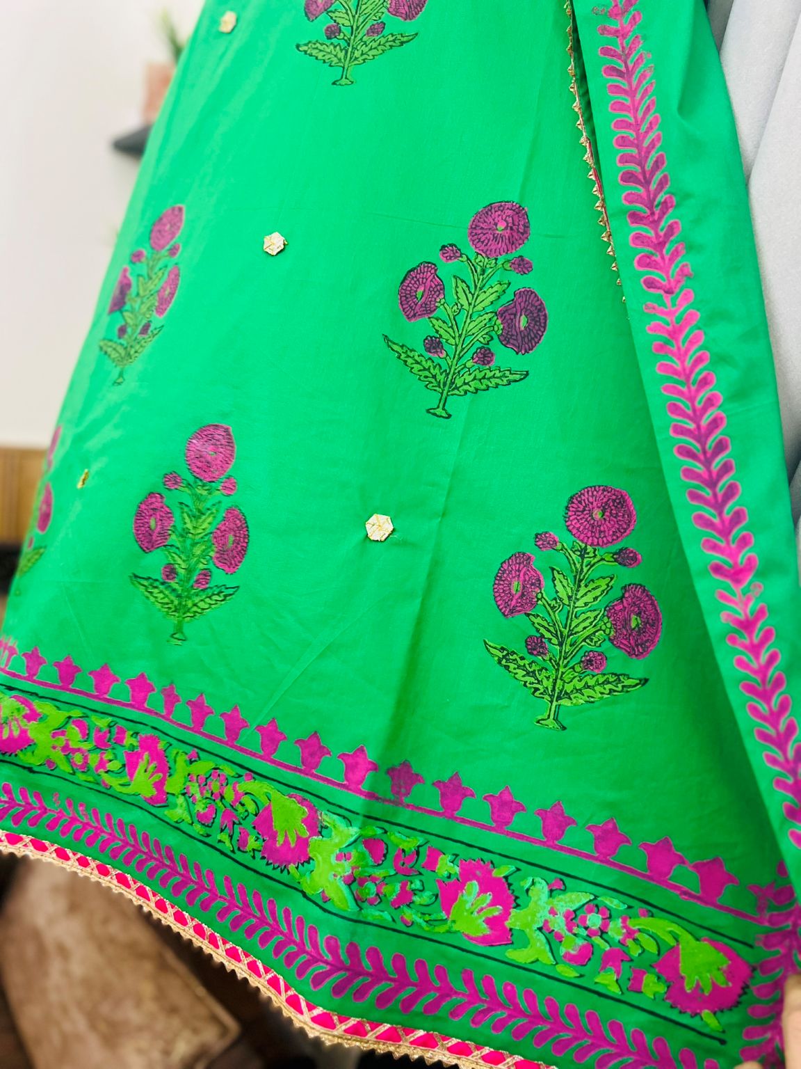 A fresh green hand block printed 2Pc set with pink poppy motifs and funky pink lace detailing. Custom measurements available.