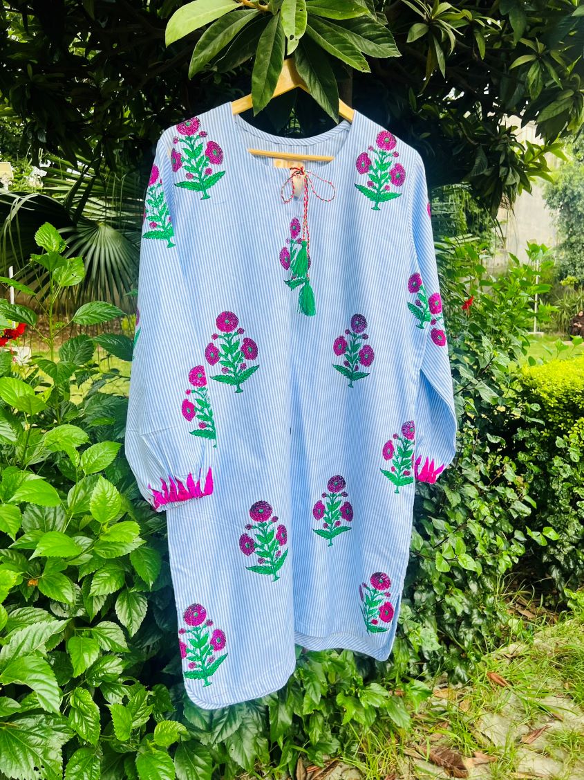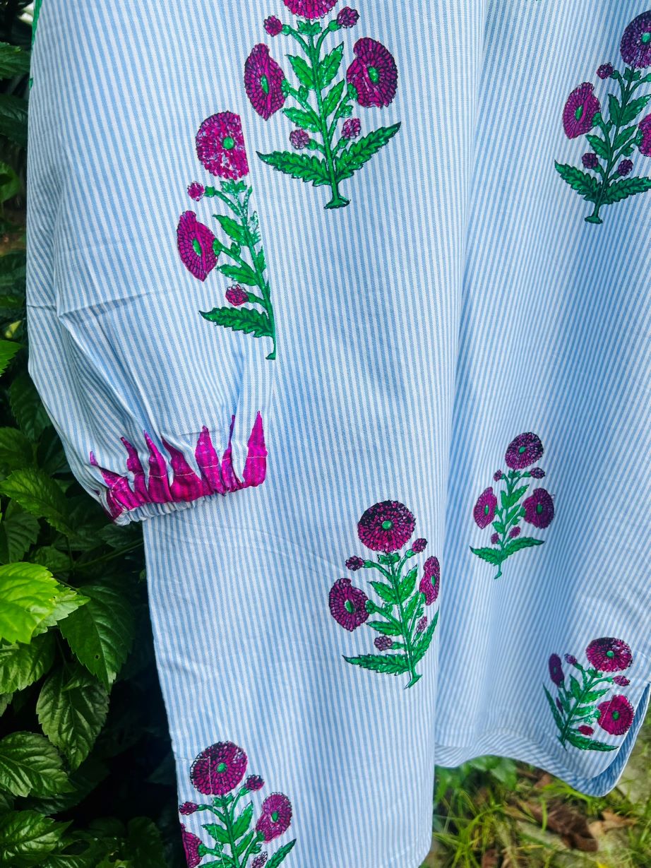 Poppy in Lines (Round) Kurta: Light blue short kurta with handblock printed maroon poppy flowers, green accents, tassel neckline, and round hem. Comfortable cotton. Custom sizes via WhatsApp.