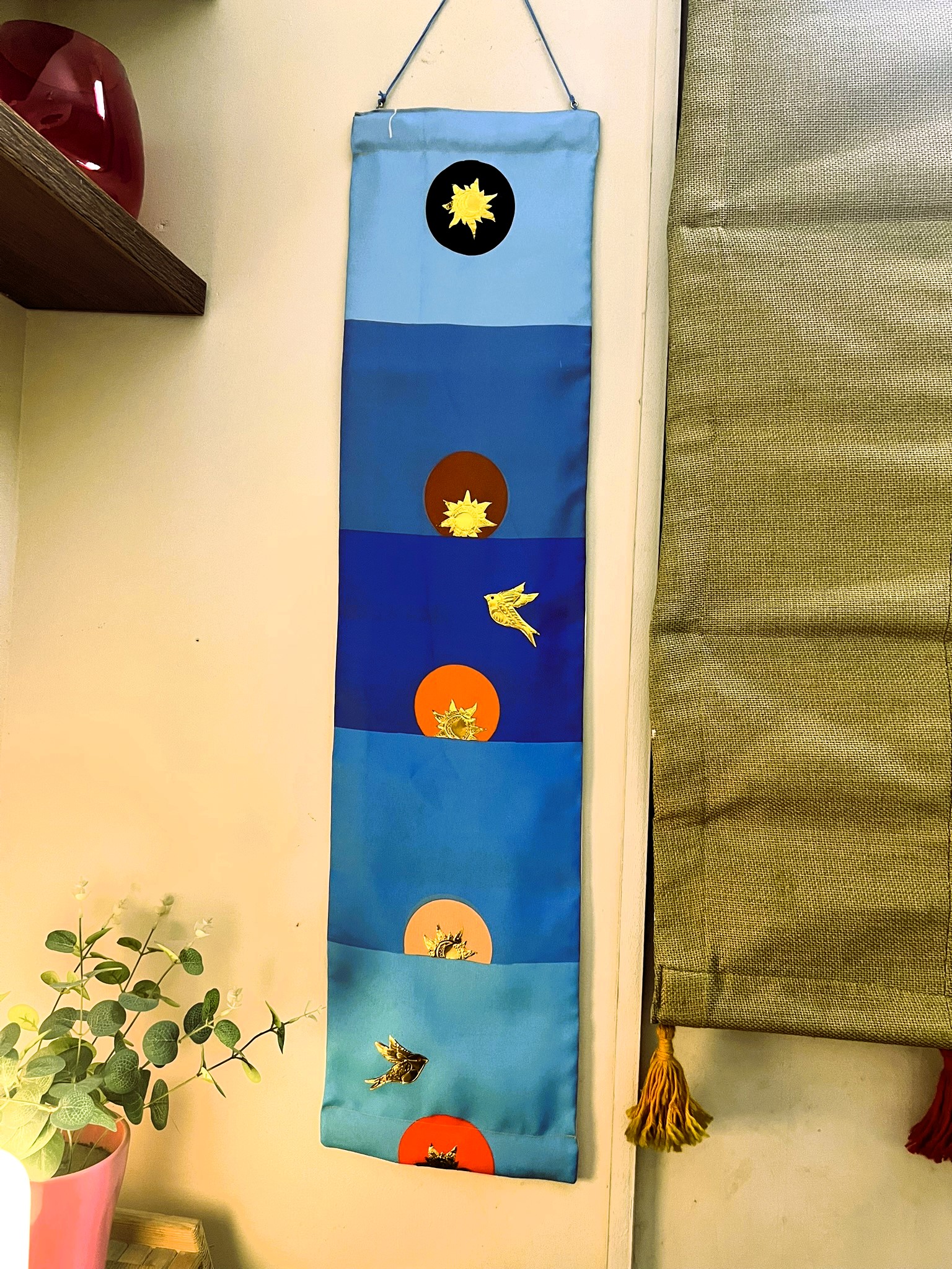 Rise of Dawn Wall Tapestry: A vertical wall tapestry featuring a sunrise scene with brass foil sun and birds. Adds warmth to living spaces. Size: 42″x 11″. Custom sizing via WhatsApp.